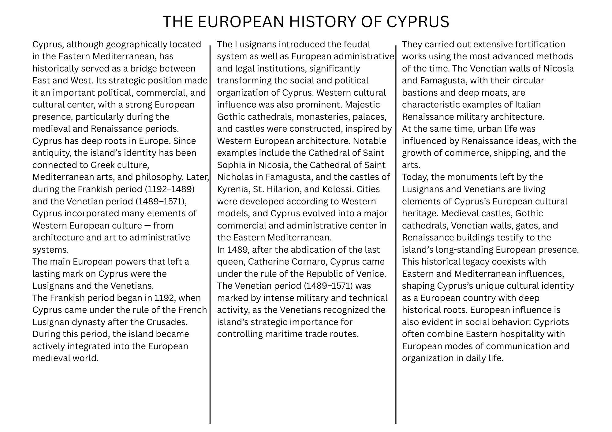 Η Κύπρος, αν και γεωγραφικά ανήκει στην Ανατολική Μεσόγειο, υπήρξε διαχρονικά ένα νησί-γέφυρα μεταξύ Ανατολής και Δύσης. Η στρατηγική της θέση την κατέστησε σημαντικό πολιτικό, εμπορικό και πολιτισμικό κέντρο, με έντονη ευρωπαϊκή παρουσία, ιδιαίτερα κατά τη μεσαιωνική και αναγεννησιακή περίοδο.