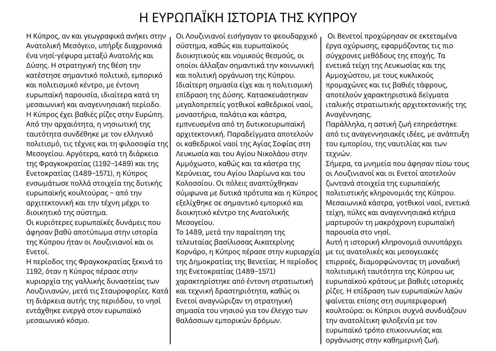 H Κύπρος έχει βαθιές ρίζες στην Ευρώπη. Από την αρχαιότητα, η νησιωτική της ταυτότητα συνδέθηκε με τον ελληνικό πολιτισμό, τις τέχνες και τη φιλοσοφία της Μεσογείου. Αργότερα, κατά τη διάρκεια της Φραγκοκρατίας (1192–1489) και της Ενετοκρατίας (1489–1571), η Κύπρος ενσωμάτωσε πολλά στοιχεία της δυτικής ευρωπαϊκής κουλτούρας – από την αρχιτεκτονική και την τέχνη μέχρι το διοικητικό της σύστημα.