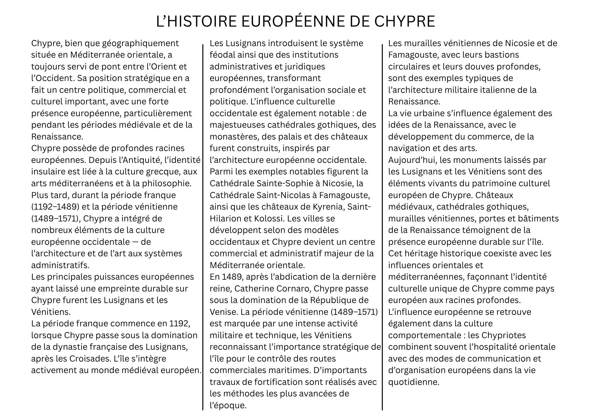 Les principales puissances européennes ayant laissé une empreinte durable sur Chypre furent les Lusignans et les Vénitiens.