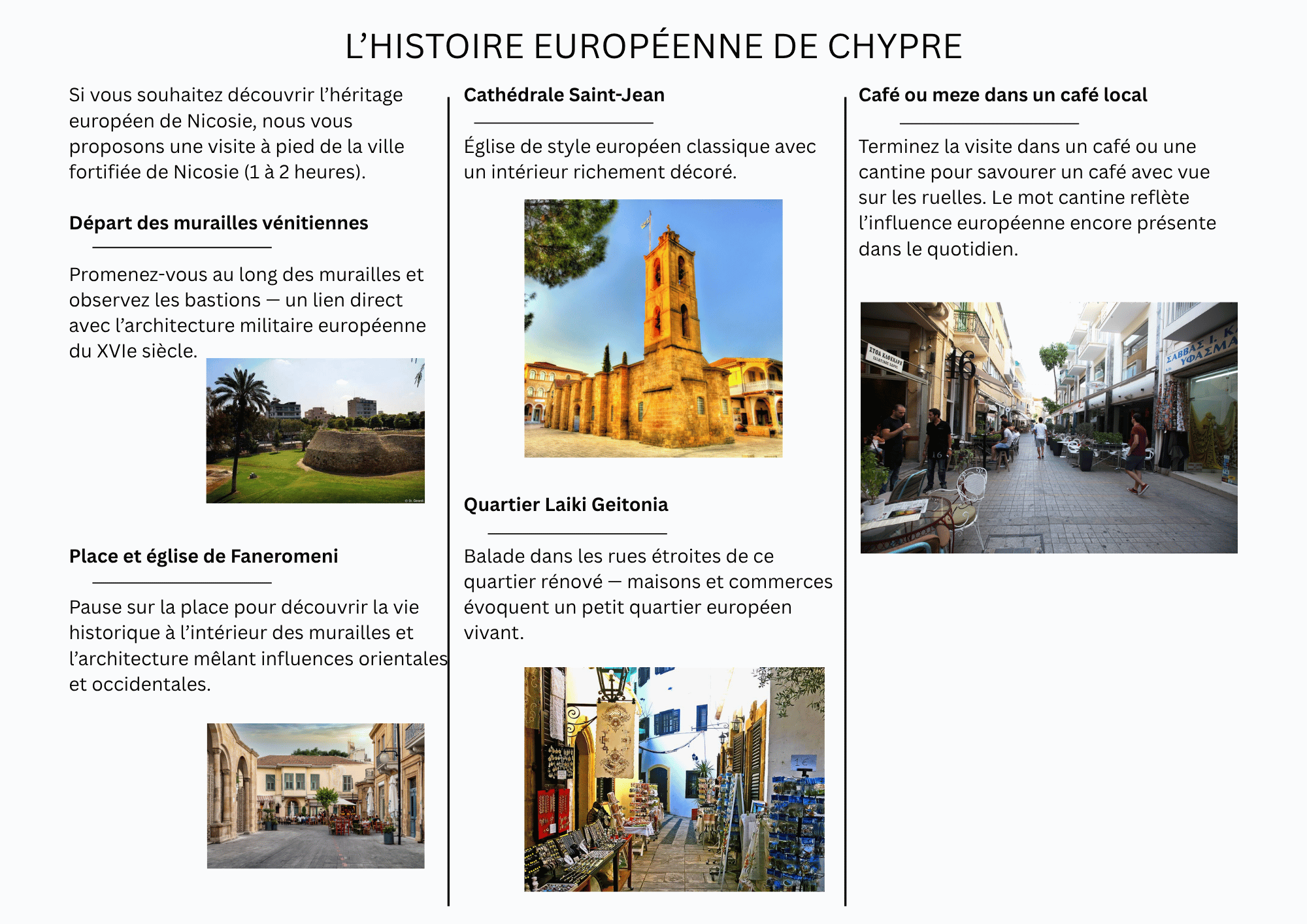Aujourd’hui, les monuments laissés par les Lusignans et les Vénitiens sont des éléments vivants du patrimoine culturel européen de Chypre. Châteaux médiévaux, cathédrales gothiques, murailles vénitiennes, portes et bâtiments de la Renaissance témoignent de la présence européenne durable sur l’île.