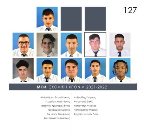 127 ΜΟ3 ΣΧΟΛΙΚΗ ΧΡΟΝΙΑ 2021-2022 Αλεξάνδρου Θεοφύλακτος Λαζαρίδης Γιώργος Γεωργίου Αναστάσιος Μουσταφά Σαλίμ Γεωργίου Χρυσοβαλάντης Ναθαναήλ Ανδρέας Θεοδώρου Χρίστος Πολυκάρπου Μάριος Κεκτσίδης Θεοφάνης Σοχ Νζόπο Γκλέν Λούκ Κωνσταντίνου Μαρίνος