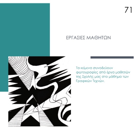 71 ΕΡΓΑΣΙΕΣ ΜΑΘΗΤΩΝ Τα κείμενα συνοδεύουν φωτογραφίες από έργα μαθητών της Σχολής μας στο μάθημα των Γραφικών Τεχνών.