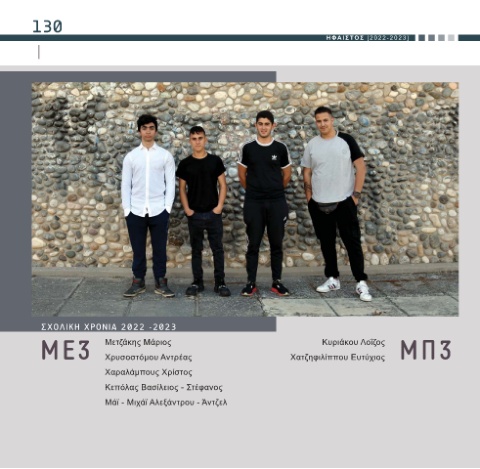 130 HΦΑΙΣΤΟΣ [2022-2023] ΣΧΟΛΙΚΗ ΧΡΟΝΙΑ 2022 -2023 Κυριάκου Λοΐζος ΜΕ3 Μετζάκης Μάριος Χατζηφιλίππου Ευτύχιος ΜΠ3 Χρυσοστόμου Αντρέας Χαραλάμπους Χρίστος Κεπόλας Βασίλειος - Στέφανος Μάϊ - Μιχάϊ Αλεξάντρου - Άντζελ