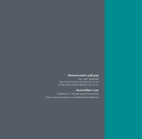 Επικοινωνήστε μαζί μας τηλ. +357 22447354 http://tech-scholi1-lef.schools.ac.cy/ email: tech-scholi1-lef@schools.ac.cy Ακολουθήστε μας Facebook: Α’ Τεχνική Σχολή Λευκωσίας https://www.facebook.com/AtechSchoolNicosia
