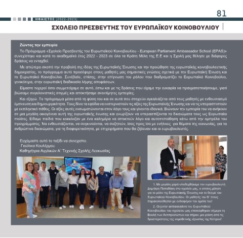 Το Πρόγραμμα «Σχολείο Πρεσβευτής του Ευρωπαϊκού Κοινοβουλίου - European Parliament Ambassador School (EPAS)»