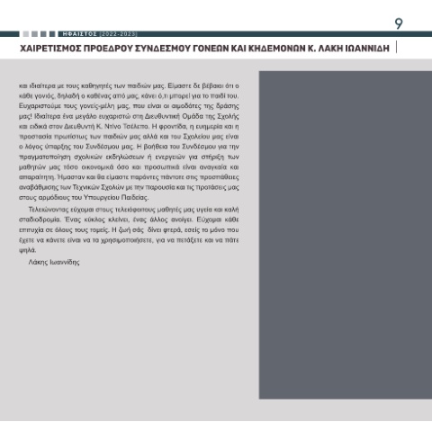 ΧΑΙΡΕΤΙΣΜΟΣ ΠΡΟΕΔΡΟΥ ΣΥΝΔΕΣΜΟΥ ΓΟΝΕΩΝ ΚΑΙ ΚΗΔΕΜΟΝΩΝ Κ. ΛΑΚΗ ΙΩΑΝΝΙΔΗ