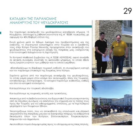 ψευδοκράτους Νοεμβρίου, σύσσωμη η μαθητική κοινότητα της Α΄ ΤΕΣΕΚ Λευκωσίας, με του έγκλημα στην τους στην Κύπρο Ραούφ Ντενκτάς προχώρησαν στην ανακήρυξη του ψευδοκράτους στα κατεχόμενα εδάφη της πατρίδας μας, ενισχύοντας Το Κεντρικό Μαθητικό Συμβούλιο της Α ΤΕΣΕΚ ΛΕΥΚΩΣΙΑΣ, αφού συνήλθε σε έκτακτη συνεδρία, συνέταξε το ακόλουθο ψήφισμα, το οποίο έθεσε «Καταδικάζουμε τη βάρβαρη τουρκική εισβολή, τη συνεχιζόμενη κ