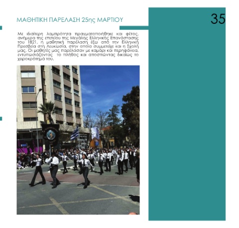 πραγματοποιήθηκε ανήμερα της επετείου της Μεγάλης Ελληνικής Επανάστασης από έξω παρέλαση Πρεσβεία στη Λευκωσία, στην οποία συμμετείχε και η Σχολή μας. Οι μαθητές μας παρέλασαν με καμάρι και περηφάνεια, αποσπώντας και