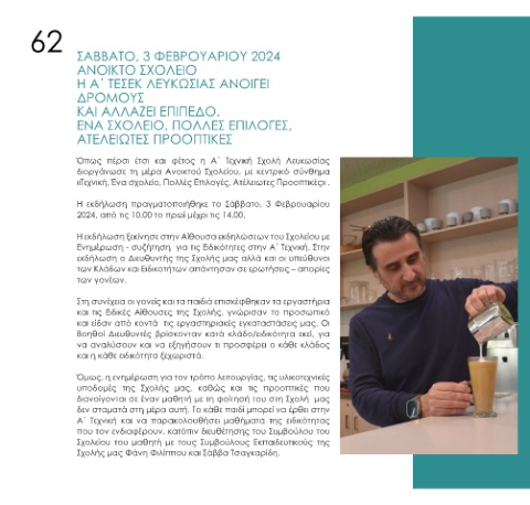 ΑΝΟΙΚΤΟ ΣΧΟΛΕΙΟ ΣΑΒΒΑΤΟ, 3 ΦΕΒΡΟΥΑΡΙΟΥ 2024 Η Α΄ ΤΕΣΕΚ ΛΕΥΚΩΣΙΑΣ ΑΝΟΙΓΕΙ ΔΡΟΜΟΥΣ ΚΑΙ ΑΛΛΑΖΕΙ ΕΠΙΠΕΔΟ. ΕΝΑ ΣΧΟΛΕΙΟ, ΠΟΛΛΕΣ ΕΠΙΛΟΓΕΣ, ΑΤΕΛΕΙΩΤΕΣ ΠΡΟΟΠΤΙΚΕΣ φέτος και έτσι πέρσι πραγματοποιήθηκε εκδήλωση 2024, από τις 10.00 το πρωί μέχρι τις 14.00. των γονέων. και η κάθε ειδικότητα ξεχωριστά. μας, Σχολής της υποδομές παρακολουθήσει να και Τεχνική Σχολής μας Φάνη Φιλίππου και Σάββα Τσαγκαρίδη.
