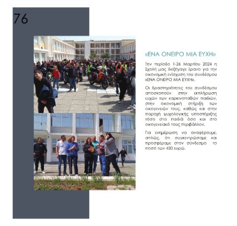 περίοδο 1-26 διεξήγαγε μας οικονομική ενίσχυση του συνδέσμου «ΕΝΑ ΟΝΕΙΡΟ ΜΙΑ ΕΥΧΗ». δραστηριότητες αποσκοπούν των οικονομική τους, ψυχολογικής παιδιά στα οικογενειακό τους περιβάλλον. ενημέρωση ότι στον προσφέραμε ποσό των 430 ευρώ.