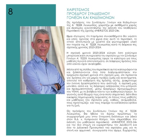 Συνδέσμου της Α΄ ΤΕΣΕΚ Λευκωσίας, χαιρετίζω με αισθήματα χαράς την ικανοποίησης Σχολής Είμαι σίγουρος ότι παρόμοια συναισθήματα θα νιώσετε χέρια στα γραπτό με την πορεία της Α΄ ΤΕΣΕΚ Λευκωσίας κατά τη διάρκεια της χρονιά 2023-2024 μπορούσε και η συνεργασία του σχολείου με τον Σύνδεσμο μαθητές δυνατά αποτελέσματα, σε διάφορες δράσεις που Μέσα από τις σελίδες του περιοδικού αυτού καταγράφονται όσα όλα τρέχουσα σχολική χρονιά στο σχολε