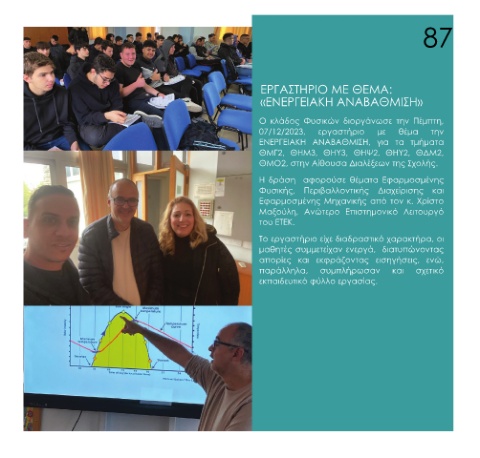 διοργάνωσε με για ΘΗΨ2, ΘΜΟ2, στην Αίθουσα Διαλέξεων της Σχολής. Η δράση αφορούσε θέματα Εφαρμοσμένης Εφαρμοσμένης Μηχανικής από τον κ. Χρίστο Επιστημονικό Το εργαστήριο είχε διαδραστικό χαρακτήρα, οι μαθητές συμμετείχαν ενεργά, διατυπώνοντας συμπλήρωσαν