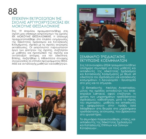 ειδικότητας ολοήμερο σεμινάριο για τους μαθητές και και Κατασκευής Κοσμήματος με θέμα: «Η ειδικότητα του σχεδιασμού και κατασκευής κοσμημάτων, η Αργυροχοΐα – Χρυσοχοΐα Νικόλας μέλος της ομάδας εκπαιδευτών του Mak- αφού μηχανημάτων μετά καθοδήγησε, του σεμιναρίου, μαθητές και εκπαιδευτές στην στα θεωρία τρισδιάστατης εκτύπωσης που βρίσκονται Το σεμινάριο παρακολούθησε, επίσης, και εκπαι