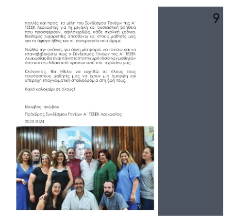 τη για το άψογο ήθος και τη συνεργασία που είχαμε. υπέροχη επαγγελματική σταδιοδρομία στη ζωή τους. Πρόεδρος Συνδέσμου Γονέων Α΄ ΤΕΣΕΚ Λευκωσίας