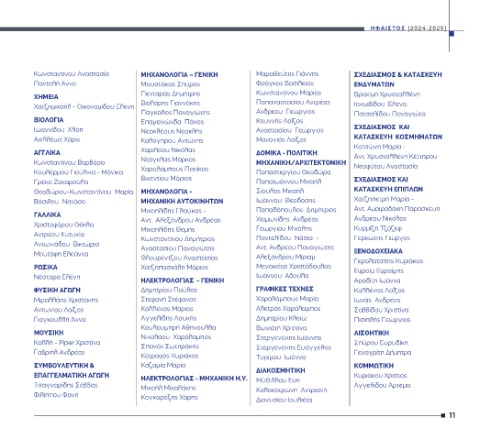 HΦΑΙΣΤΟΣ [2024-2025] ΣΧΕΔΙΑΣΜΟΣ & ΚΑΤΑΣΚΕΥΗ ΕΝΔΥΜΑΤΩΝ Βραχίμη Χρυσταλλένη Ιακωβίδου Έλενα Πατσαλίδου Παναγιώτα ΣΧΕΔΙΑΣΜΟΣ ΚΑΙ ΚΑΤΑΣΚΕΥΗ ΚΟΣΜΗΜΑΤΩΝ Κοτσώνη Μαρία - Αντ. Χρυσταλλένη Κέττηρου Νεοφύτου Αναστασία ΣΧΕΔΙΑΣΜΟΣ ΚΑΙ ΚΑΤΑΣΚΕΥΗ ΕΠΙΠΛΩΝ Χατζηπετρή Μαρία - Αντ. Αμοιραδάκη Παρασκευή Ανδρέου Νικόλας Κυρμίζη Τζόζεφ Γερκώτης Γιώργος ΞΕΝΟΔΟΧΕΙΑΚΑ Γερολατσίτης Κυριάκος Εφραίμ Εφραίμης Αροδίτη Ιωάννα Καλλένος Λοΐζος Ιωνάς Ανδρέας Σαββίδου Χριστίνα Πισιηλής