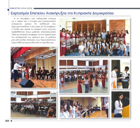 έχει ως η ημέρα που η Κύπρος μας ανακηρύχθηκε Σε πραγματοποιήθηκε τη Δευτέρα, 30 Σεπτεμβρίου, η Σχολή μας τίμησε το ιστορικό αυτό γεγονός, μαθητές υλικό με ιστορικές αναφορές για την πορεία προς κράτους μας απήγγειλαν ποιήματα, ενώ παρουσιάστηκαν χοροί αλλά και τραγούδια από τη χορωδία μας.