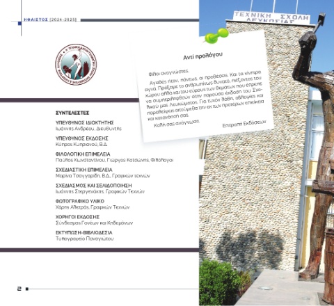[2024-2025] ΣΥΝΤΕΛΕΣΤΕΣ ΥΠΕΥΘΥΝΟΣ ΙΔΙΟΚΤΗΤΗΣ Ιωάννης Ανδρέου, Διευθυντής ΥΠΕΥΘΥΝΟΣ ΕΚΔΟΣΗΣ Κύπρος Κυπριανού, Β.Δ. ΦΙΛΟΛΟΓΙΚΗ ΕΠΙΜΕΛΕΙΑ Παύλος Κωνσταντίνου, Γιώργος Κοτσώνης, Φιλόλογοι ΣΧΕΔΙΑΣΤΙΚΗ ΕΠΙΜΕΛΕΙΑ Μαρίνα Τσαγγαρίδη, Β.Δ., Γραφικών τεχνών ΣΧΕΔΙΑΣΜΟΣ ΚΑΙ ΣΕΛΙΔΟΠΟΙΗΣΗ Ιωάννης Στεργενάκης, Γραφικών Τεχνών ΦΩΤΟΓΡΑΦΙΚΟ ΥΛΙΚΟ Χάρης Αλετράς, Γραφικών Τεχνών ΧΟΡΗΓΟΙ ΕΚΔΟΣΗΣ Σύνδεσμος Γονέων και Κηδεμόνων ΕΚΤΥΠΩΣΗ-ΒΙΒΛΙΟΔΕΣΙΑ Τυπογραφείο Παναγιώ