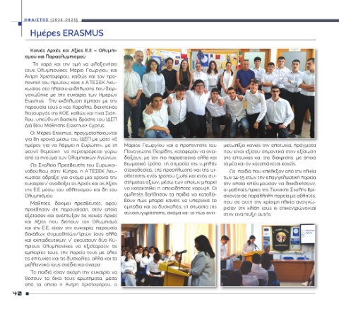 [2024-2025] Ημέρες ERASMUS Κοινές Αρχές και Αξίες Ε.Ε – Ολυμπι- σμού και Παραολυμπισμού φιλοξενήσει να τιμή την και και Γεωργίου Μάριο Ολυμπιονίκες Άντρη Χριστοφόρου, καθώς και τον προ- πονητή του πρώτου, είχε η Α΄ΤΕΣΕΚ Λευ- κωσίας στο πλαίσιο εκδήλωσης που διορ- γανώθηκε με την ευκαιρία των Ημερών Erasmus. Την εκδήλωση τίμησαν με την παρουσία τους ο κος Κορέλης, διοικητικός λειτουργός της ΚΟΕ, καθώς και η κα Σιάη- λου, υπεύθυνη βασικής δράσης