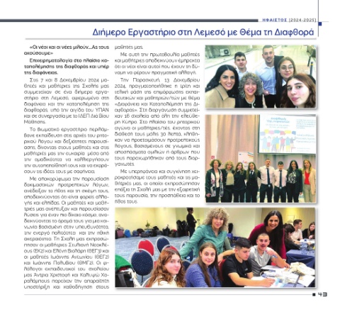 «Οι νέοι και οι νέες μιλούν….Ας τους ακούσουμε» Επιχειρηματολογία στο πλαίσιο κα- ταπολέμησης της διαφθοράς και υπέρ της διαφάνειας. Δεκεμβρίου 2024 και 8 Στις 7 Σχολής της μαθήτριες και θητές διήμερο ένα σε συμμετείχαν αφιερωμένο Λεμεσό, στη στήριο καταπολέμηση την και διαφάνεια διαφθοράς, υπό την αιγίδα του ΥΠΑΝ και σε συνεργασία με το ΙΔΕΠ Διά Βίου Μάθησης. Το βιωματικό εργαστήριο περιλάμ- βανε εκπαίδευση στις αρχές του