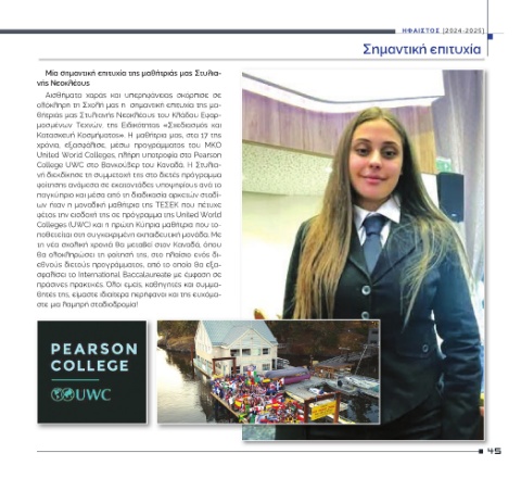 και ολόκληρη τη Σχολή μας η σημαντική επιτυχία της μα- θήτριάς μας Στυλιανής Νεοκλέους του Κλάδου Εφαρ- της Κατασκευή Κοσμήματος». Η μαθήτρια μας, στα 17 της μέσω United World Colleges, πλήρη υποτροφία στο Pearson College UWC στο Βανκούβερ του Καναδά. Η Στυλια- νή διεκδίκησε τη συμμετοχή της στο διετές πρόγραμμα φοίτησης ανάμεσα σε εκατοντάδες υποψηφίους ανά το παγκύπριο και μέσα από τη διαδικασία αρκετών σταδί- ων ήταν η μοναδική μαθήτρια της ΤΕΣΕΚ που πέ