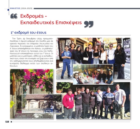 Εκδρομές - Εκπαιδευτικές Επισκέψεις πραγματο- Οκτωβρίου 2024, ποιήθηκε η πρώτη εκδρομή της Σχολής μας σε ορεινές περιοχές της επαρχίας Λευκωσίας και Λάρνακας. Συγκεκριμένα, οι μαθητές/τριες του Α΄ έτους επισκέφθηκαν την Ασίνου, οι μαθητές/ τριες του Β’ έτους τα Λεύκαρα, ενώ τον Καλο- παναγιώτη επισκέφθηκαν αυτοί του Γ΄έτους. Οι μαθητές και οι μαθήτριες, αλλά και οι εκπαιδευ- τικοί τους, είχαν την ευκαιρία να ξεφύγουν από την καθημερινότητά τους απολαμβάνοντας έ