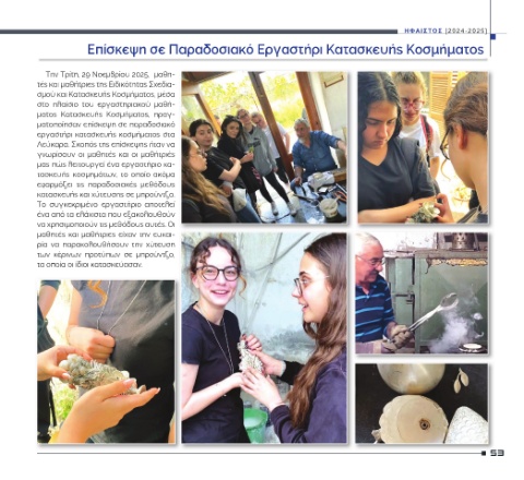 Την Τρίτη, 29 Νοεμβρίου 2025, μαθη- τές και μαθήτριες της Ειδικότητας Σχεδια- σμού και Κατασκευής Κοσμήματος, μέσα μαθή- εργαστηριακού του πραγ- Κοσμήματος, Κατασκευής ματοποίησαν επίσκεψη σε παραδοσιακό εργαστήρι κατασκευής κοσμήματος στα Λεύκαρα. Σκοπός της επίσκεψης ήταν να γνωρίσουν οι μαθητές και οι μαθήτριές μας πώς λειτουργεί ένα εργαστήριο κα- τασκευής κοσμημάτων, το οποίο ακόμα μεθόδους παραδοσιακές τις κατασκευής και χύτευσης σε μπρο