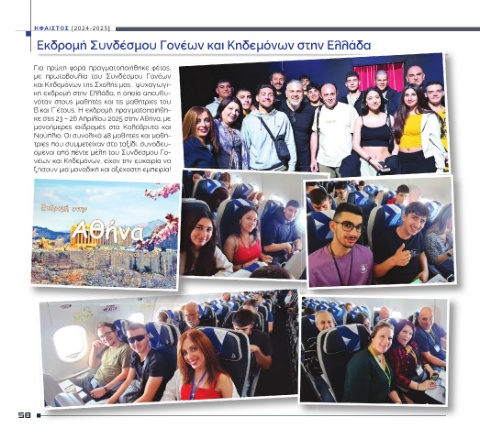 [2024-2025] Για πρώτη φορά πραγματοποιήθηκε φέτος, του και Κηδεμόνων της Σχολής μας, ψυχαγωγι- κή εκδρομή στην Ελλάδα, η οποία απευθυ- νόταν στους μαθητές και τις μαθήτριες του Β΄και Γ΄έτους. Η εκδρομή πραγματοποιήθη- κε στις 23 – 26 Απριλίου 2025 στην Αθήνα, με εκδρομές Ναύπλιο. Οι συνολικά 48 μαθητές και μαθή- τριες που συμμετείχαν στο ταξίδι, συνοδευ- όμενοι από πέντε μέλη του Συνδέσμου Γο- νέων και Κηδεμόνων, είχαν την ευκαιρία να ζήσουν μια μοναδική και αξέχαστη