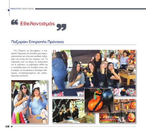 [2024-2025] Πέμπτη, 31 τροπή Πρόνοιας της Σχολής μας πραγ- ματοποίησε με επιτυχία σχολικό παζα- ράκι για ενίσχυση του ταμείου της. Το παζαράκι είχε ως θέμα το Halloween και οι μαθητές, οι μαθήτριες αλλά και οι εκπαιδευτικοί της Σχολής είχαν την ευκαιρία να αγοράσουν διάφορα εδέ- ανταποκρινόμενοι