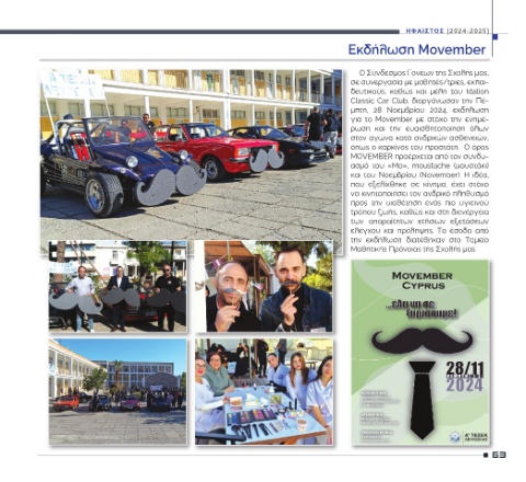 HΦΑΙΣΤΟΣ Εκδήλωση Movember Ο Σύνδεσμος Γονέων της Σχολής μας, σε συνεργασία με μαθητές/τριες, εκπαι- μέλη και καθώς δευτικούς, Classic Car Club, διοργάνωσαν την Πέ- Νοεμβρίου 2024, μπτη, 28 για το Movember με στόχο την ενημέ- ευαισθητοποίηση την και ρωση στον αγώνα κατά ανδρικών ασθενειών, όπως ο καρκίνος του προστάτη. Ο όρος MOVEMBER προέρχεται από τον συνδυ- του «Mo», moustache (μουστάκι) ασμό και του Νοεμβρίου (November). Η ιδέα, κίνημα, σε