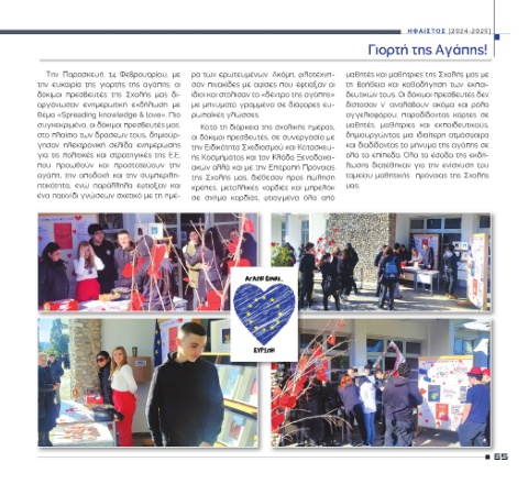 HΦΑΙΣΤΟΣ Γιορτή της Αγάπης! μαθητές και μαθήτριες της Σχολής μας με καθοδήγηση και δευτικών τους. Οι δόκιμοι πρεσβευτές δεν ακόμα αναλάβουν παραδίδοντας και μαθήτριες δημιουργώντας μια ιδιαίτερη ατμόσφαιρα και διαδίδοντας το μήνυμα της αγάπης σε όλα τα επίπεδα. Όλα τα έσοδα της εκδή- λωσης διατέθηκαν για την ενίσχυση του ταμείου μαθητικής πρόνοιας της Σχολής