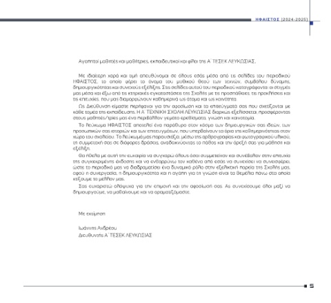μυθικού Με ιδιαίτερη χαρά και τιμή απευθύνομαι σε όλους εσάς μέσα από τις σελίδες του περιοδικού δημιουργικότητας και συνεχούς εξέλιξης. Στις σελίδες αυτού του περιοδικού καταγράφονται οι στιγμές μας μέσα και έξω από τις κτηριακές εγκαταστάσεις της Σχολής με τις προσπάθειες, τις προκλήσεις και Ως Διεύθυνση είμαστε περήφανοι για την αφοσίωση και τα επιτεύγματά σας που σχετίζονται με κάθε τομέα της εκπαίδευσης. Η Α΄ ΤΕΧΝΙΚΗ ΣΧΟΛΗ ΛΕΥΚΩΣΙΑΣ