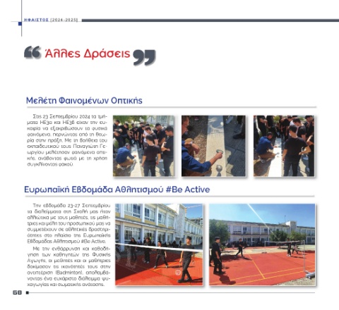 [2024-2025] Στις 23 Σεπτεμβρίου 2024 τα τμή- ΗΕ3β και εξακριβώσουν φαινόμενα, περνώντας από τη θεω- ρία στην πράξη. Με τη βοήθεια του εκπαιδευτικού τους Παναγιώτη Γε- ωργίου μελέτησαν φαινόμενα οπτι- φωτιά ανάβοντας συγκλίνοντος φακού. Την εβδομάδα 23-27 Σεπτεμβρίου στη αλλιώτικα με τους μαθητές, τις μαθή- τριες και μέλη του προσωπικού μας να συμμετέχουν σε αθλητικές δραστηρι- πλαίσιο Εβδομάδας Αθλητισμού #Be Active. ενθάρρυνση κ