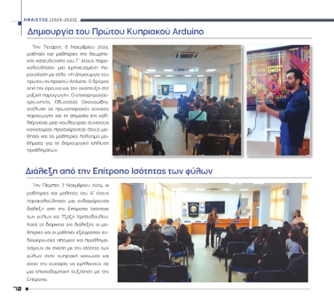 [2024-2025] Τετάρτη, 6 μαθήτριες και κής κατεύθυνσης του Γ’ έτους παρα- μια ρουσίαση με τίτλο «Η Δημιουργία του πρώτου κυπριακού Arduino. Ο δρόμος από την έρευνα και την ανάπτυξη στη μαζική παραγωγή». Ο επιχειρηματίας- Οδυσσέας ανέλυσε τις πρωτοποριακές τεχνικές παραγωγής και τη σημασία της καλ- λιέργειας μιας κουλτούρας συνεχούς καινοτομίας, προσφέροντας στους μα- θητές και τις μαθήτριες πολύτιμα μα- δημιουργική τη για Την Πέμπτη, 7 Νοεμβρίου 2024,