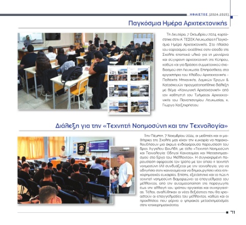 HΦΑΙΣΤΟΣ Παγκόσμια Ημέρα Αρχιτεκτονικής Τη Δευτέρα, 7 Οκτωβρίου 2024, εορτά- στηκε στην Α΄ ΤΕΣΕΚ Λευκωσίας η Παγκό- Αρχιτεκτονικής. Ημέρα του εορτασμού εκτέθηκε στην είσοδο της Σχολής εποπτικό υλικό για τη μοντέρνα και σύγχρονη αρχιτεκτονική της Κύπρου, καθώς και για δράσεις συμμετοχικού σχε- διασμού στη Λευκωσία. Επιπρόσθετα, στα εργαστήρια του Κλάδου Αρχιτεκτονικής - Πολιτικής Μηχανικής, Δομικών Έργων & Κατασκευών πραγματοποιήθηκε διάλεξη με θέμα «Κοινωνική