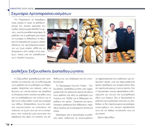 [2024-2025] Παρασκευή, 22 2024, είχαμε τη χαρά να φιλοξενή- τεχνικό Ομίλου Χατζηγιώρκη Νικόλα Γεωρ- γίου, για ένα μοναδικό σεμινάριο. Οι μαθητές και οι μαθήτριες μας είχαν την ευκαιρία να διδαχθούν τη θεω- ρία της παρασκευής ψωμιών ολικής και μπριός, ζύμη δοκιμάσουν στην πράξη να τα φτιά- την υπό του κ. Νικόλα Γεωργίου. Σεξουαλική σκοπεί να ενισχύσει και να ενδυναμώσει τους μαθητές και τις μαθήτριες με πληρο- και δεξιότητες βιώνουν με υπευθυνότητα κα