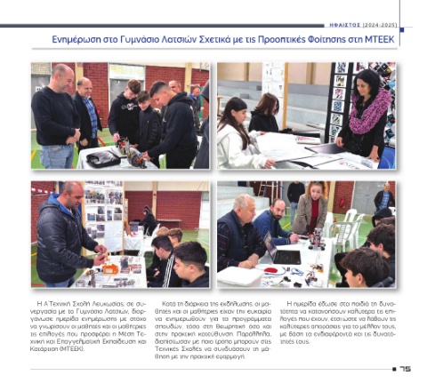 Η Α΄Τεχνική Σχολή Λευκωσίας, σε συ- νεργασία με το Γυμνάσιο Λατσιών, διορ- με ενημέρωσης ημερίδα γάνωσε να γνωρίσουν οι μαθητές και οι μαθήτριες τις επιλογές που προσφέρει η Μέση Τε- χνική και Επαγγελματική Εκπαίδευση και Κατάρτιση (ΜΤΕΕΚ).