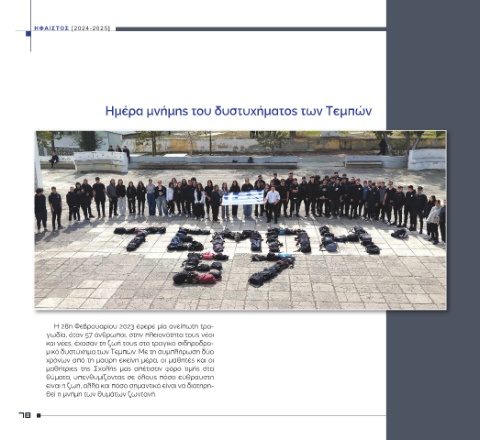 [2024-2025] Ημέρα μνήμης του δυστυχήματος των Τεμπών Η 28η Φεβρουαρίου 2023 έφερε μία ανείπωτη τρα- γωδία, όταν 57 άνθρωποι, στην πλειονότητα τους νέοι και νέες, έχασαν τη ζωή τους στο τραγικό σιδηροδρο- μικό δυστύχημα των Τεμπών. Με τη συμπλήρωση δύο χρόνων από τη μαύρη εκείνη μέρα, οι μαθητές και οι μαθήτριες της Σχολής μας απέτισαν φόρο τιμής στα θύματα, υπενθυμίζοντας σε όλους πόσο εύθραυστη είναι η ζωή, αλλά και πόσο σημαντικό είναι ν