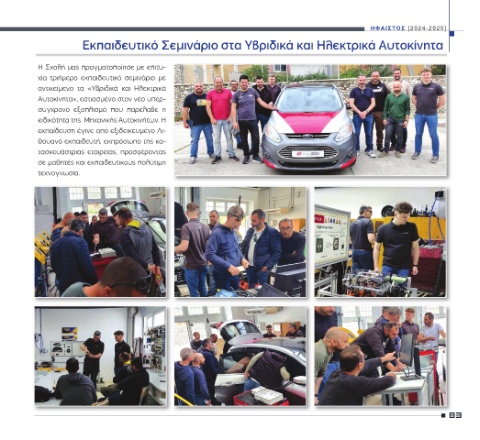 εκπαιδευτικό τα «Υβριδικά Αυτοκίνητα», εστιασμένο στον νέο υπερ- που εξοπλισμό ειδικότητα της Μηχανικής Αυτοκινήτων. Η εκπαίδευση έγινε από εξιδεικευμένο Λι- θουανό εκπαιδευτή, εκπρόσωπο της κα- τασκευάστριας εταιρείας, προσφέροντας σε μαθητές και εκπαιδευτικούς πολύτιμη