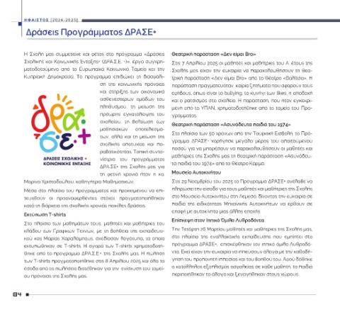 μέρος μεγάλο ποσού για να μπορέσουν να παρακολουθήσουν οι μαθητές και μαθήτριες της Σχολής μας τη θεατρική παράσταση «Ασυνόδευ- Στις 29 Νοεμβρίου του 2025 το Πρόγραμμα ΔΡΑΣΕ+ ανέλαβε να πληρώσει την είσοδο για τους μαθητές και μαθήτριες της Σχολής στο Μουσείο Αυτοκινήτου στη Λεμεσό, δίνοντας την ευκαιρία σε Αυτοκινήτων Την Τετάρτη 26 Μαρτίου μαθητές και μαθήτριες της Σχολής μας, εκπαίδευσης πρόγραμμα ΔΡΑΣΕ+, επισκέφθηκα